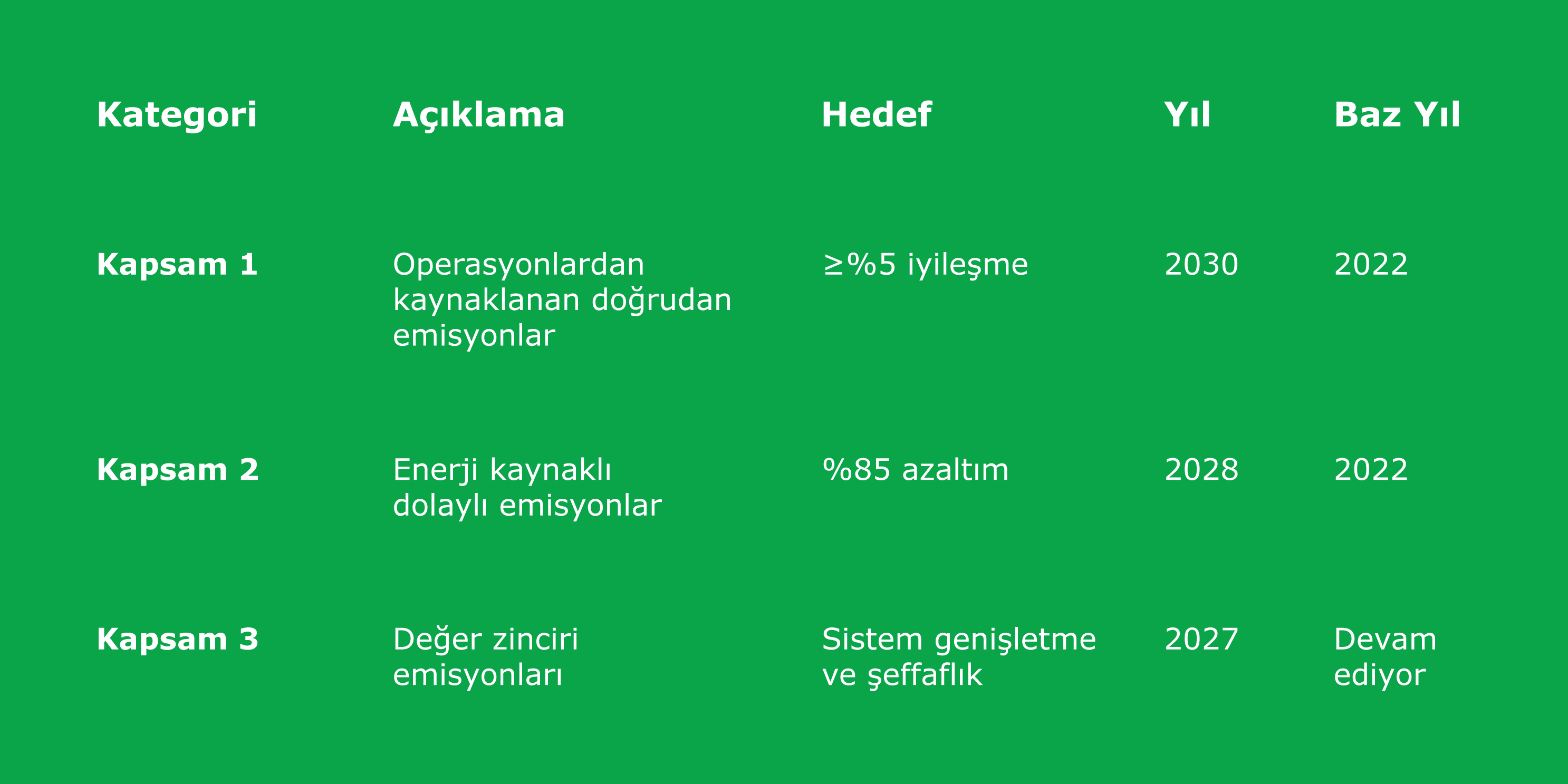 Karbon yönetimi stratejimiz çerçevesinde, enerji kaynaklı dolaylı emisyonların (Scope 2) azaltımıöncelikli odak alanı olarak belirlenmiştir. Bu doğrultuda Şirketimiz, 2022 baz yılına göre Scope 2 emisyonlarını 2028 yılına kadar %85 oranında azaltmayı; doğrudan operasyonlardan kaynaklanan emisyonlarda (Scope 1) ise 2030 yılına kadar en az %5 oranında iyileşme sağlamayı taahhüt etmektedir.